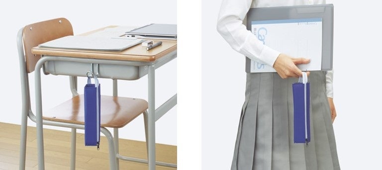 「ペンケース<C2>」の"使わない時はスリムで場所をとらない"デザインは、GIGAスクール構想の導入により、タブレットやPCといったICTツールなどの学習アイテムが増え、机上が狭くなり、荷物が多くなった学生の困りごとを解決するペンケースとしてオススメです。また、取っ手になるファスナー部分を机の横に掛けて、机を広く使うことも可能です。