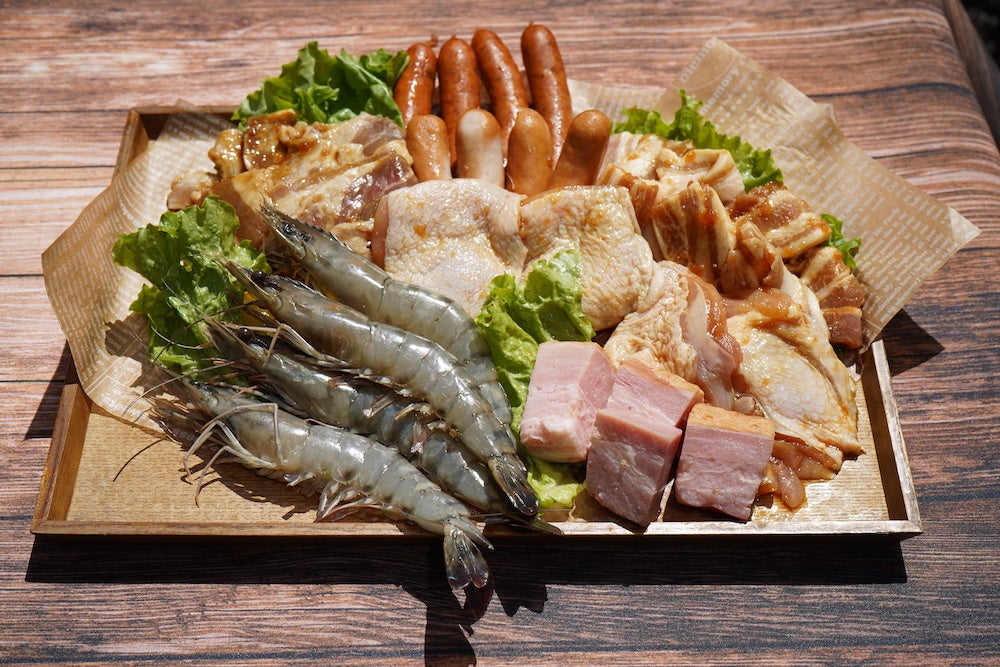 セット内容:牛バラ、豚バラ、ベーコン、ソーセージ、有頭エビ、野菜盛り合わせ、ほか