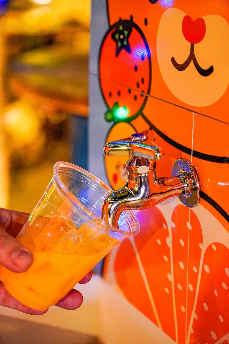 八幡浜の地元では、ミカンは果実そのものだけでなくジュースとしても愛されています。今回、当店ではこの味わいをより楽しみ八幡浜の柑橘文化を現地さながらに体感していただけるように、地元で開発された蛇口型のジュースサーバー「蛇口からみかんジュース」を導入し、テラス内に設置いたしました。お客様が直接、蛇口からグラスへジュースを注ぎ、八幡浜みかんの注ぎたてジュースを味わっていただけます。この蛇口型ジュースサーバーが設置されているのは、都内では当店が唯一の場所となります。