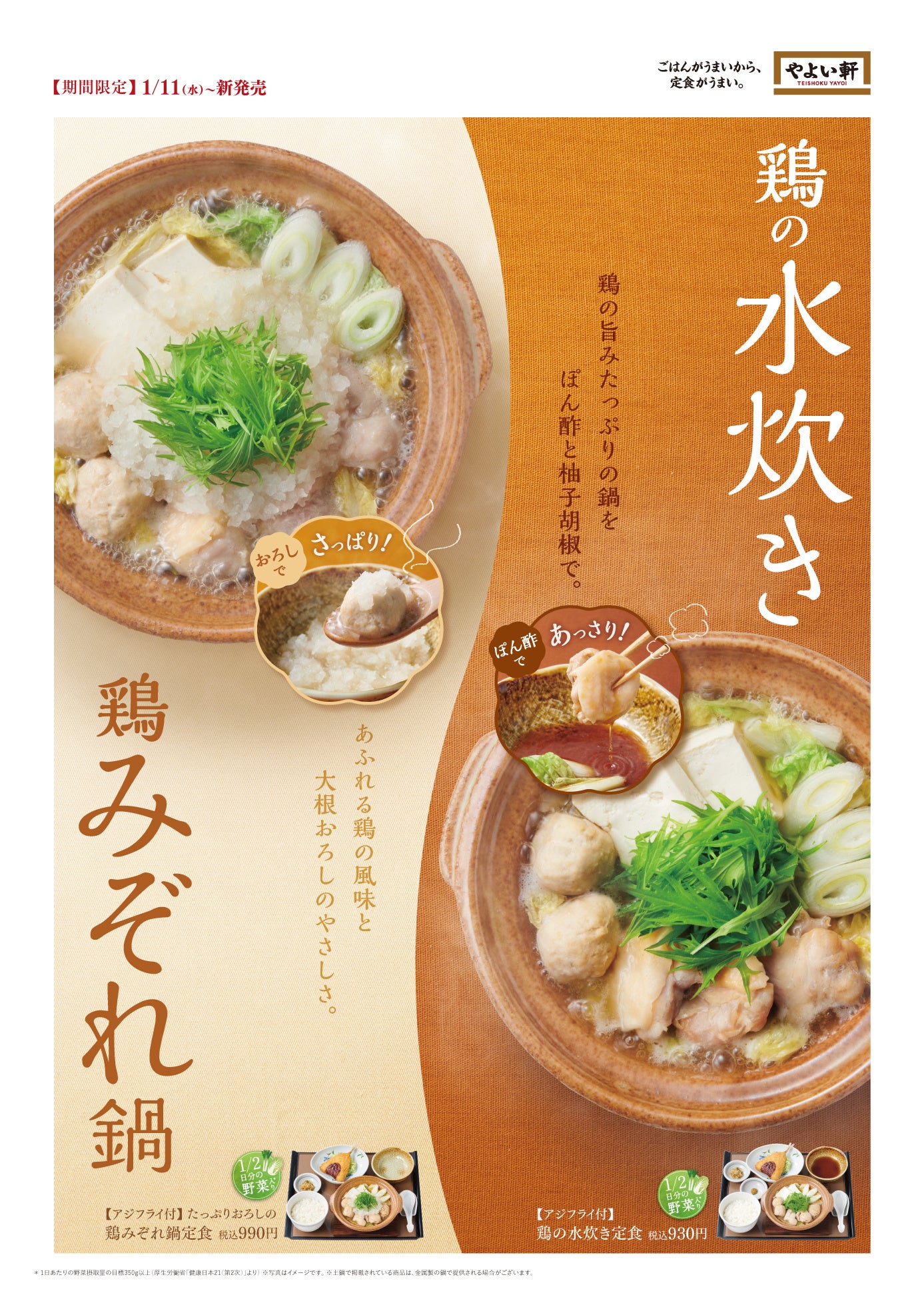 「やよい軒」の“冬鍋”第3弾 鶏と野菜の旨味凝縮スープが、冷えた身体に染み渡る!『【アジフライ付】鶏の水炊き定食』、さっぱり大根おろしの『【アジフライ付】たっぷりおろしの鶏みぞれ鍋定食』