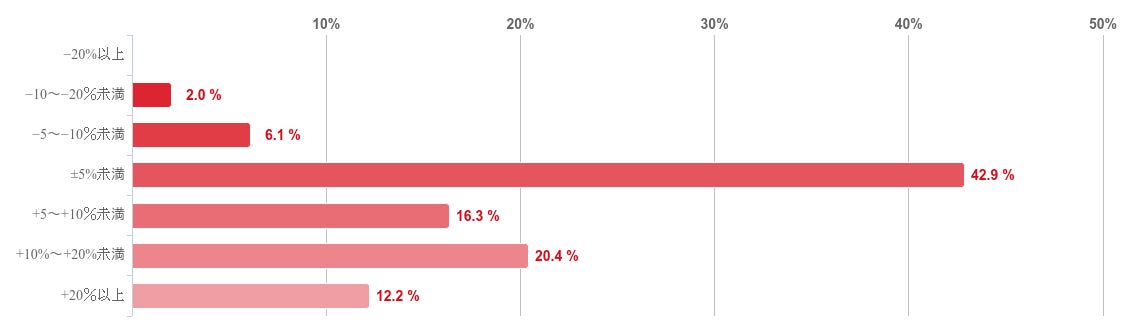 「±5%未満」が42.9%で最も多く、「+10%~+20%未満」が20.4%、「+5%~+10%未満」が16.3%と続いた。