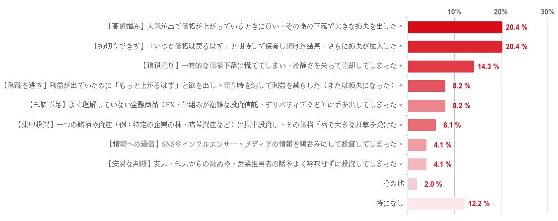 「【高値掴み】人気が出て価格が上がっているときに買い、その後の下落で大きな損失を出した」と「【損切りできず】「いつか価格はもどるはず」と期待して保有した結果、さらに損失が拡大した」との回答が共に20.4%で最も多かった。