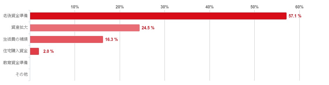 「老後資金準備」が57.1%で過半数となり圧倒的多かったが、「資産拡大」も24.5%となり、多く回答を集めた。
