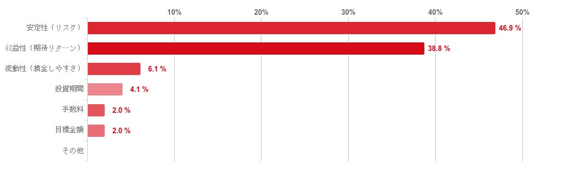また、投資先を選ぶ際に重要視していることとして「安定性(リスク)」が最も多く約5割となり、「収益性(期待リターン)」と回答した人(約4割)の割合を上回った。