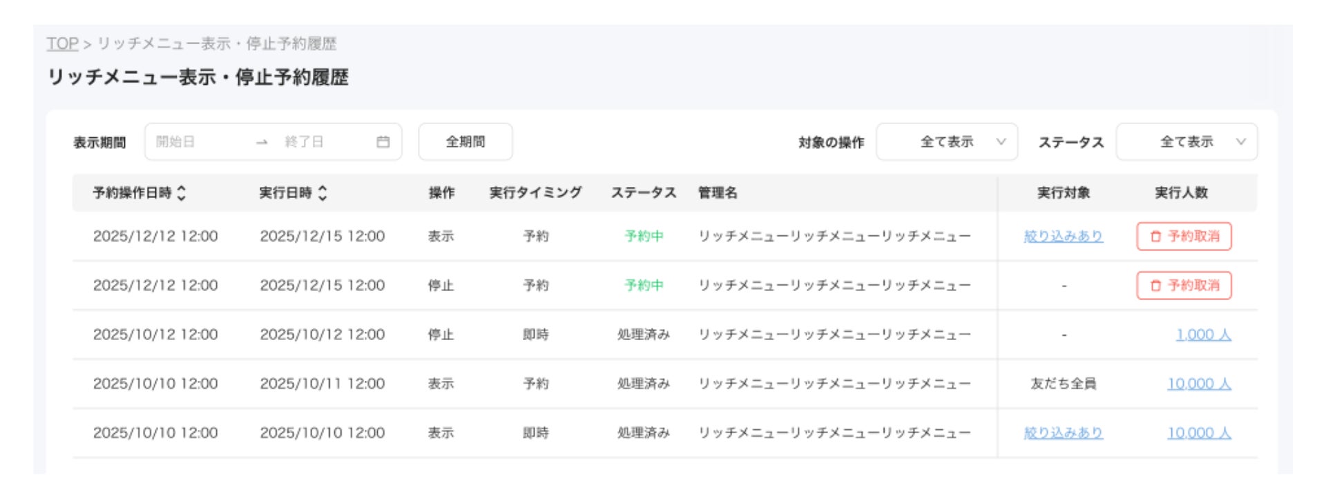 さらに、リッチメニューの「表示」および「表示停止」の履歴を確認できる機能が追加されました。これにより、どのリッチメニューがいつ、どの友だちに表示されたのかを把握でき、切替のタイミング確認や過去の設定見直しが容易になります。履歴を参照することで、「どの導線が効果的だったか」を振り返ることができ、運用改善に活用しやすい仕様です。