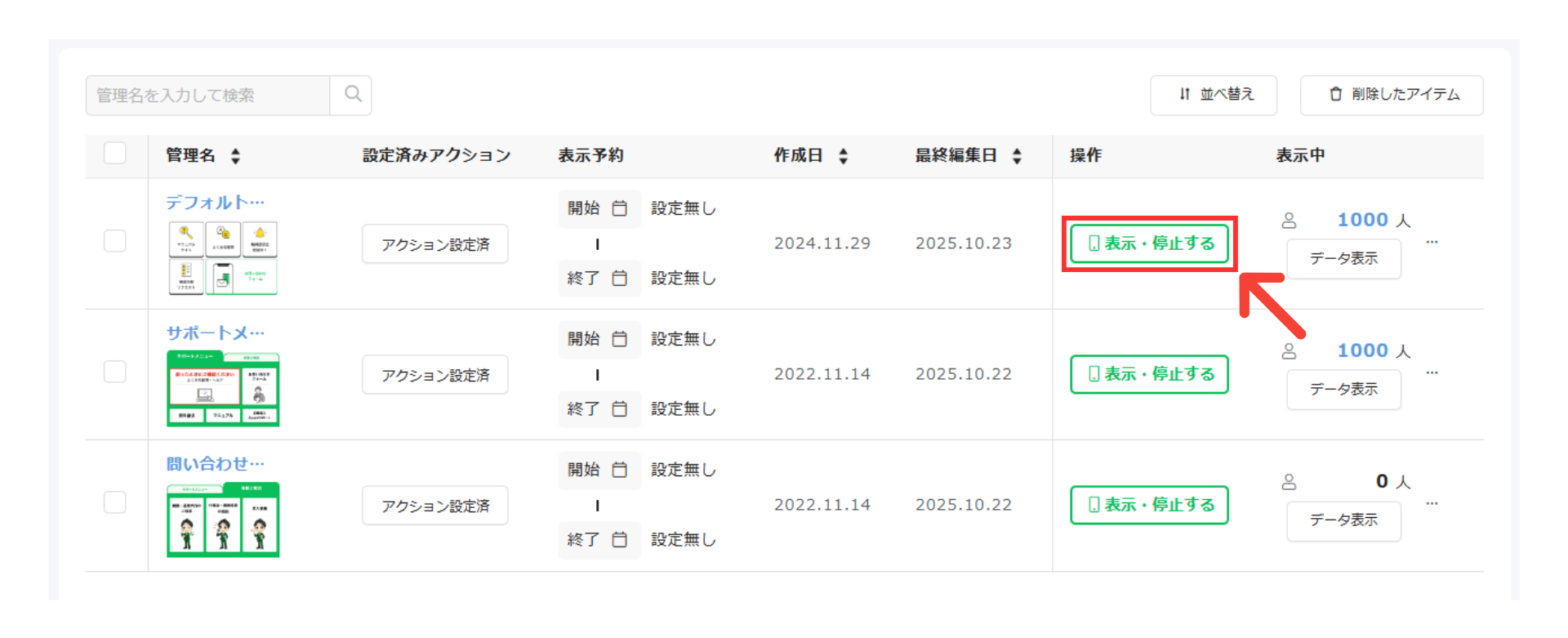リッチメニュー管理画面から「表示・停止」が可能に