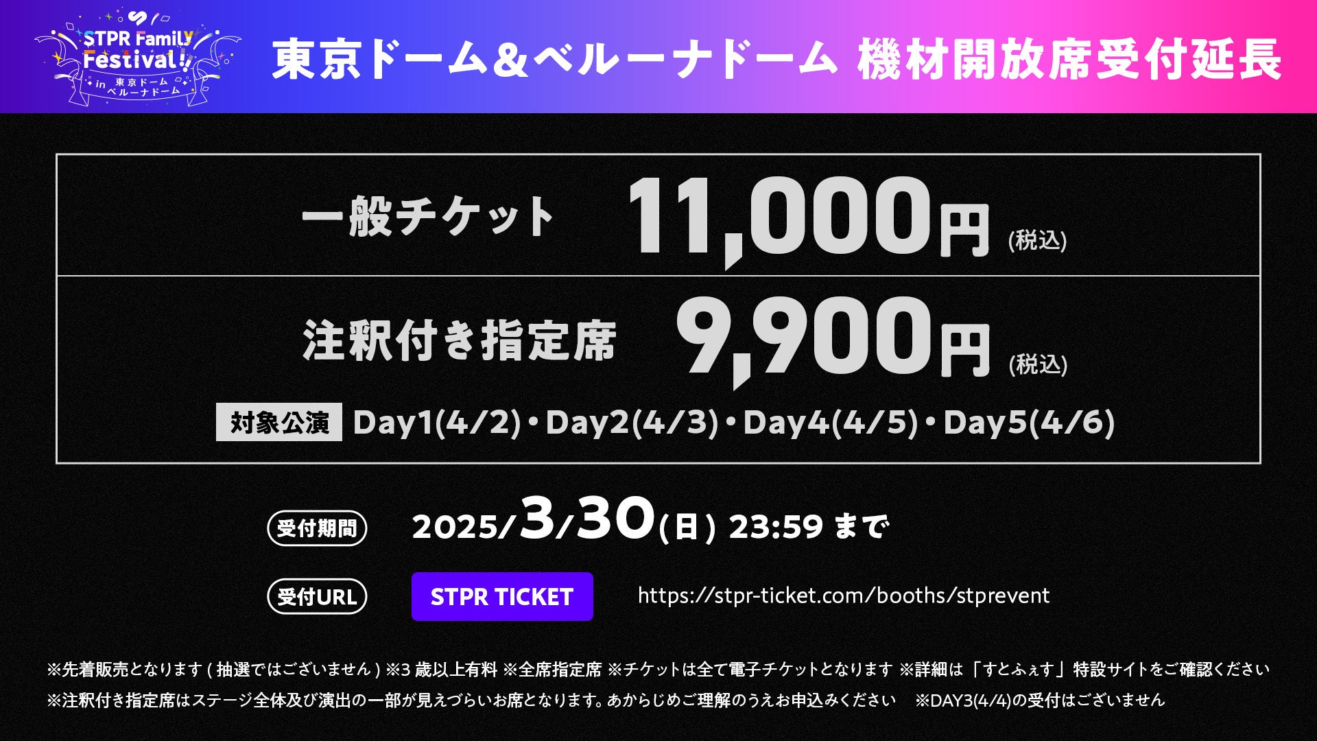 株式会社STPR (本社:東京都渋谷区 代表:柏原 真人、以下STPR)は、弊社所属のグループ「すとぷり」「Knight A - 騎士A -」「AMPTAKxCOLORS」「めておら - Meteorites -」が東京ドーム・ベルーナドームに集結する大型ライブフェス『STPR Family Festival!!』の『一般指定席』『注釈付き指定席』の申込受付について、自社サイト<STPR TICKET>での受付期間を2025年3月30日(日)23:59まで延長することをお知らせいたします。