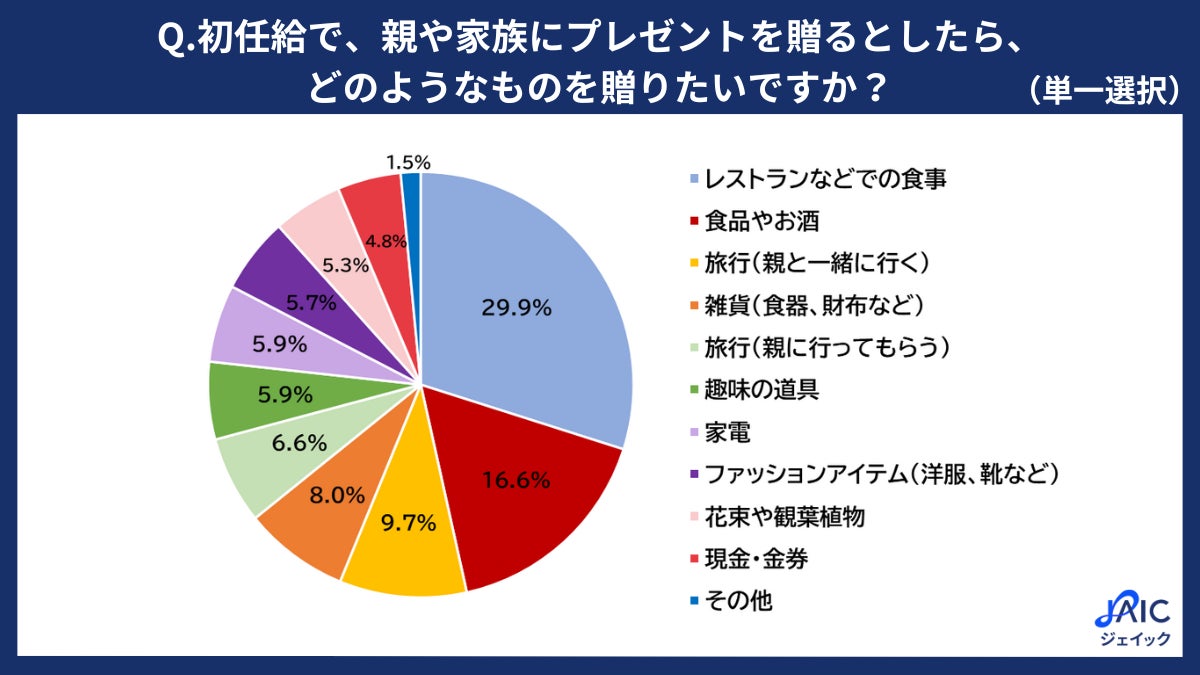 ■初任給で贈りたい、親や家族へのプレゼント:1位「レストランなどでの食事」(29.9%)