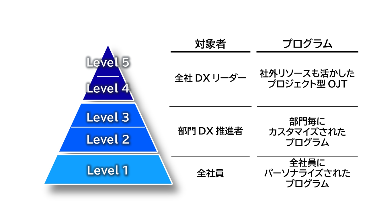 このプログラムは、3つのレイヤー、5つのレベルで構成されています。全員に一律のメニューでなく、一人ひとりの現在のスキルレベルに合わせて、さらには所属している部門の特性やニーズに合わせてカスタマイズされたプログラムになっています。