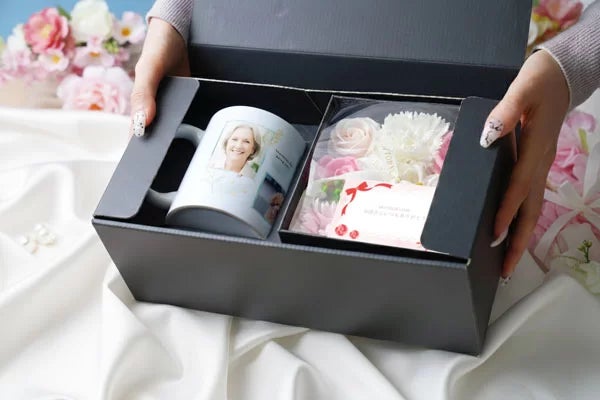 華やかなソープフラワーボックスと、写真・名前・メッセージを自由に入れられるオリジナルプリントマグカップがセットになった、特別感あふれるギフト商品です。