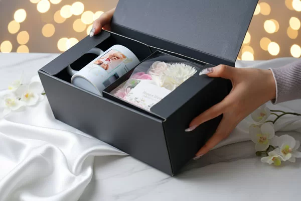 黒いギフトボックス×リボンの高級感ある梱包でそのまま贈れる