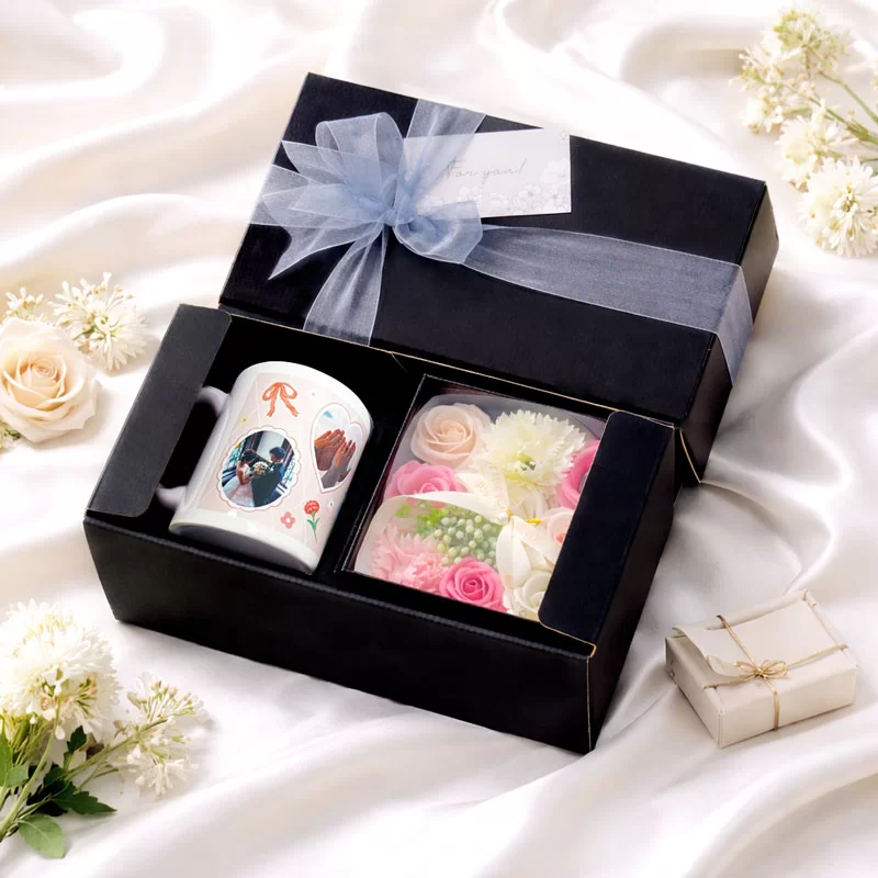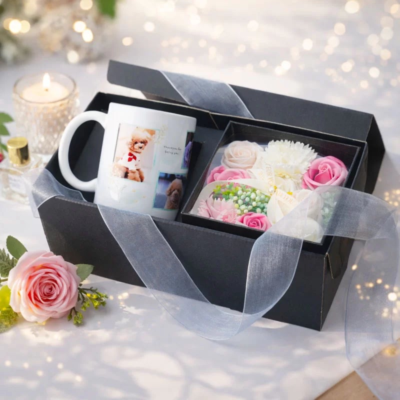 セット内容:オリジナルプリントマグカップ×1、ソープフラワー×1、メッセージカード×1、専用ギフトボックス(リボン付き)×1