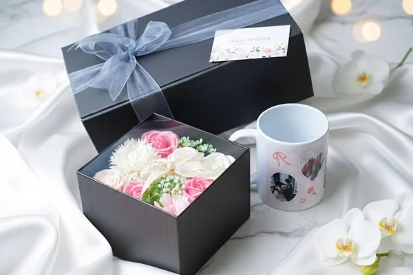 華やかなソープフラワーボックスとオリジナルマグカップのセット