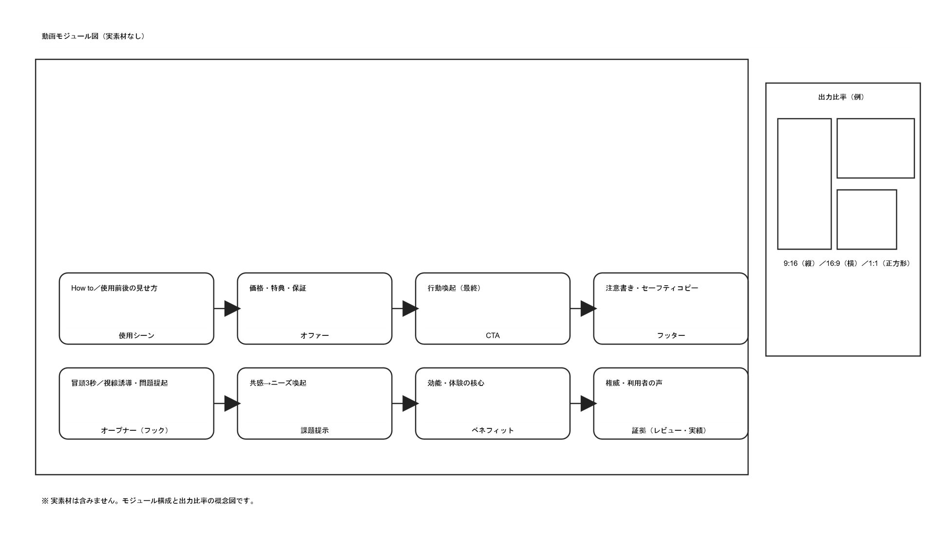 ・クリエイティブのモジュール化:オープナー/証拠(レビュー・実績)/ベネフィット/CTAをブロック化し、差し替えで高速に新作を供給。