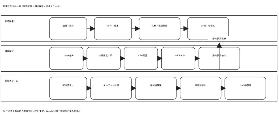 これにより、常時配信/週次検証/月次スケールの運用設計に移行し、媒体横断の学習スピードを高めます。