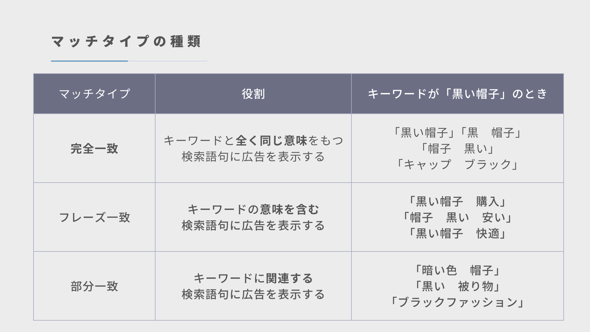 2.マッチタイプとはあ(完全一致・フレーズ一致・部分一致)