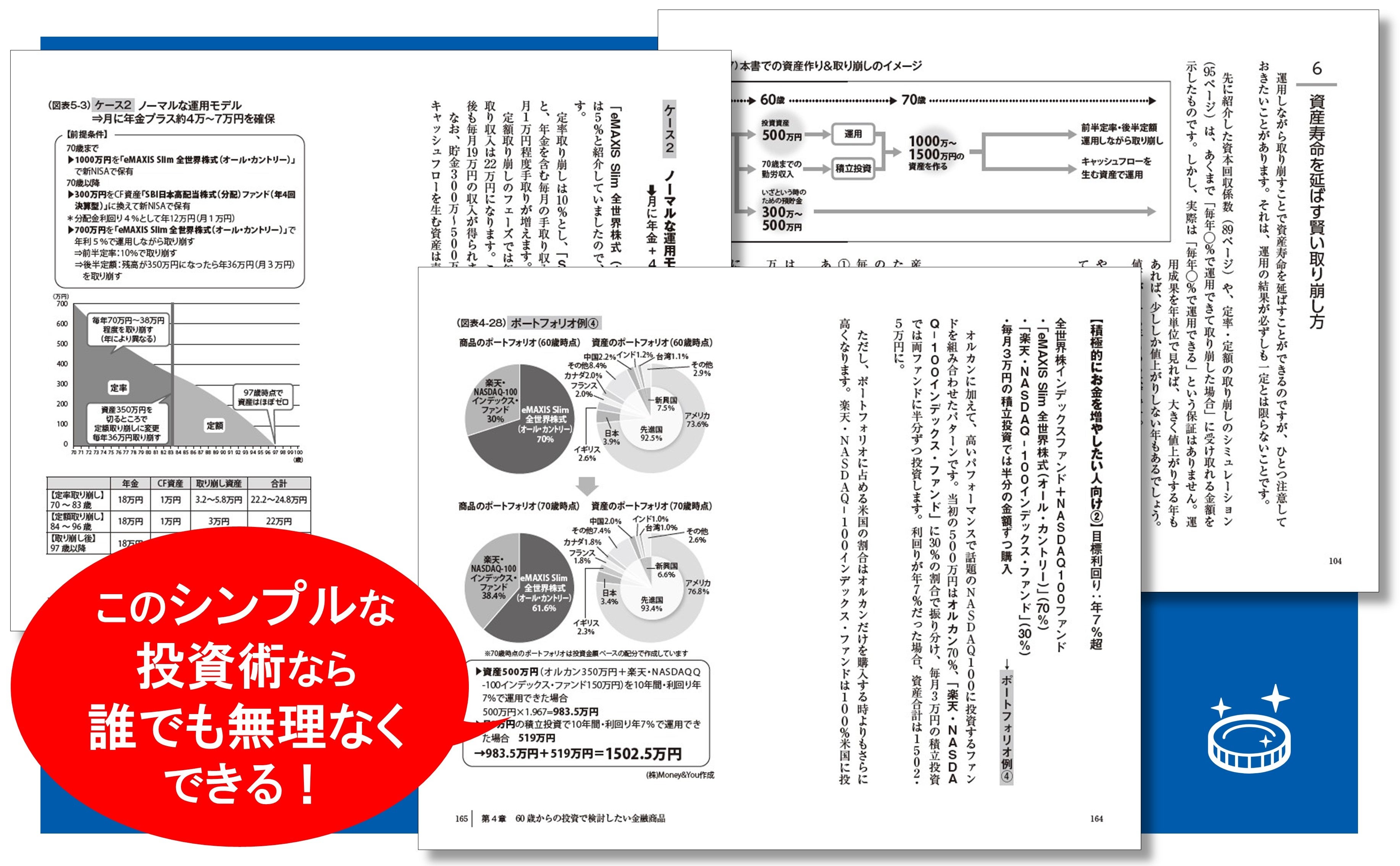 60歳から手堅く投資をして、100歳まで「年金+月3~10万円」で老後の安心を手に入れる。それだけでなく、「キャッシュフロー資産」+「取り崩し戦略」を活用して、70歳以降、資産寿命を延ばしながら、資産を賢く使い切る。そのためのノウハウが、具体的に紹介されています。