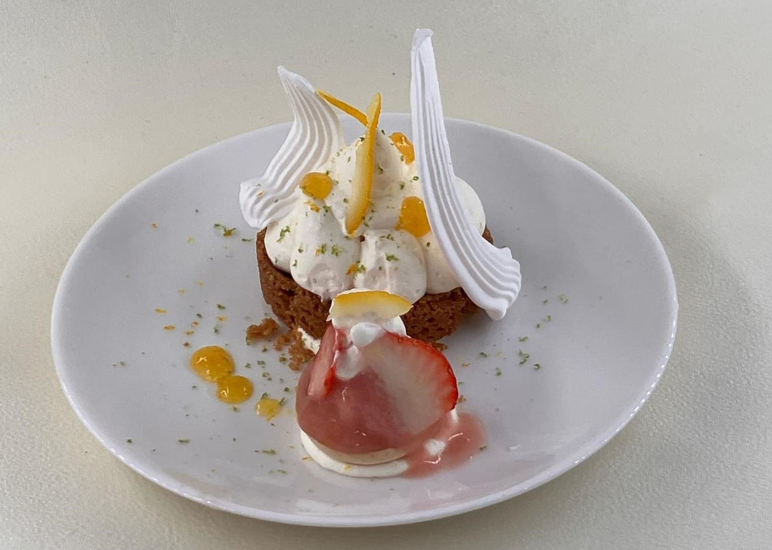 本日のアシェットには、講習会の前日に視察した貴重な柚子が使用されました。柚子を食べるイメージがあまりない中、スイーツにすると七色に変化することを表現したといいます。具体的には、柚子と白餡を合わせ、タルト生地に枯露柿と柚子を刻んで混ぜたとのことです。