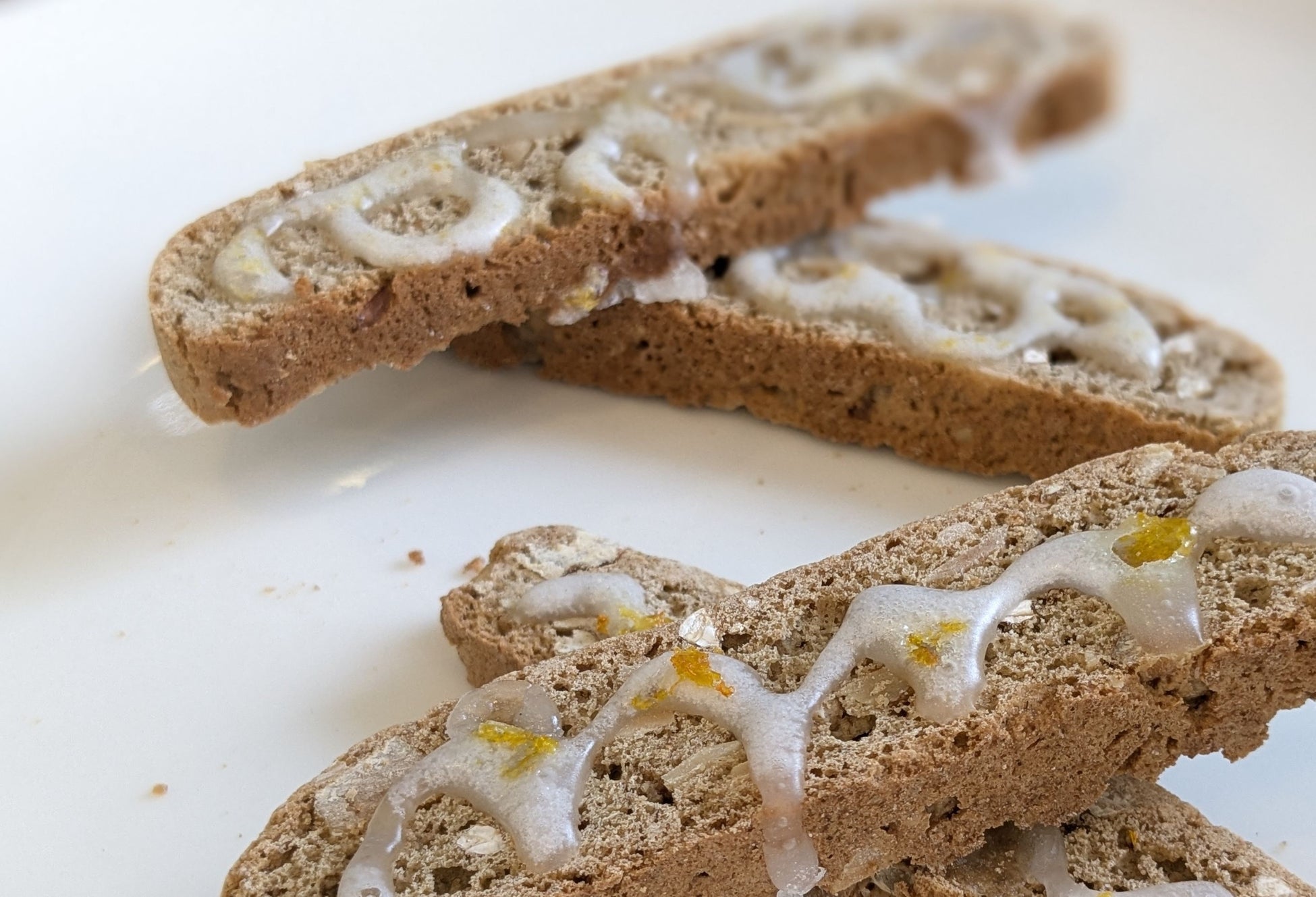 県産柚子と忍野村のそば粉を使用したビスコッティを開発。堅さの異なる2種類が用意されました。山梨県にある昔ながらの菓子「紅梅焼き」を意識したとのことで、懐かしさの中に二人の拘りを感じるものでした。さらに、ミュージアムカフェでの販売開始に合わせ、「焼き菓子 Pinna(やきがし ぴな)」というブランド名を披露。「Pinna」は、英語で「羽、翼」という意味があることから、ほっとひと息、羽休めの時間のおともになれたらという想いから名付けたとのことです。