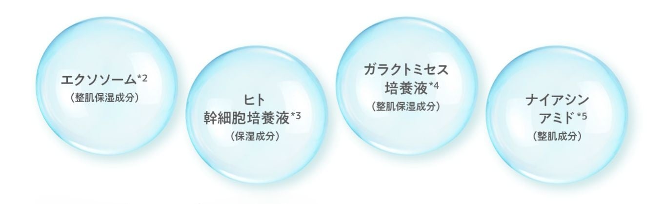 美容サイエンス発想として話題成分のエクソソーム*2やヒト幹細胞培養液*3を配合。肌の保湿やバリア機能をサポートし、ガラクトミセス培養液*4やナイアシンアミド*5が透明感*1を与え、ハリツヤ素肌へ導きます。