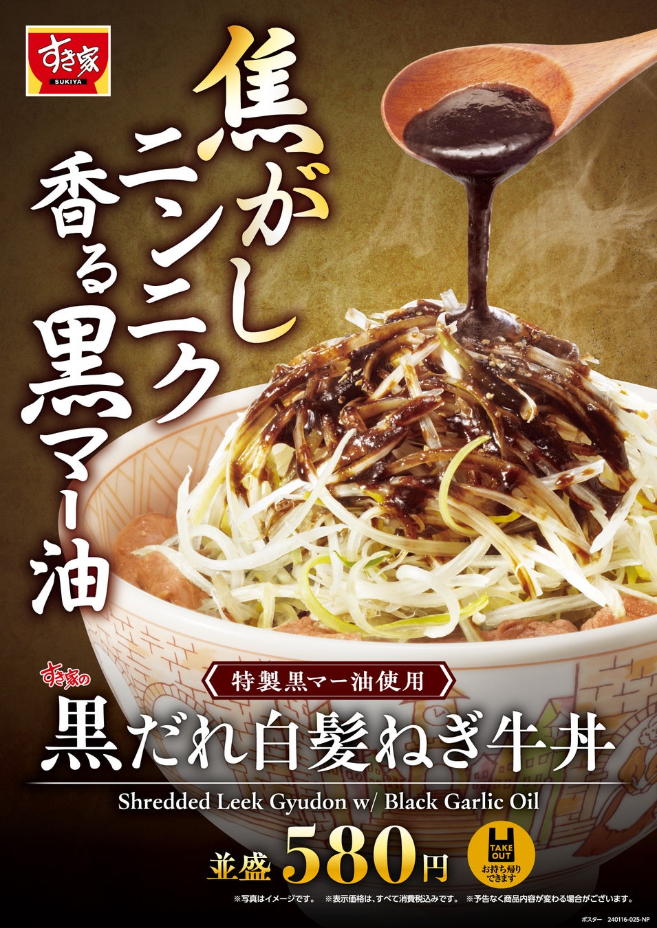 株式会社すき家(代表取締役社長:笹川 直樹 本社:東京都港区)が展開する牛丼チェーン店「すき家」では、1月16日(火)AM9:00より、人気商品“白髪ねぎ牛丼”の新たな仲間として「黒だれ白髪ねぎ牛丼」を全国の店舗で新発売します。