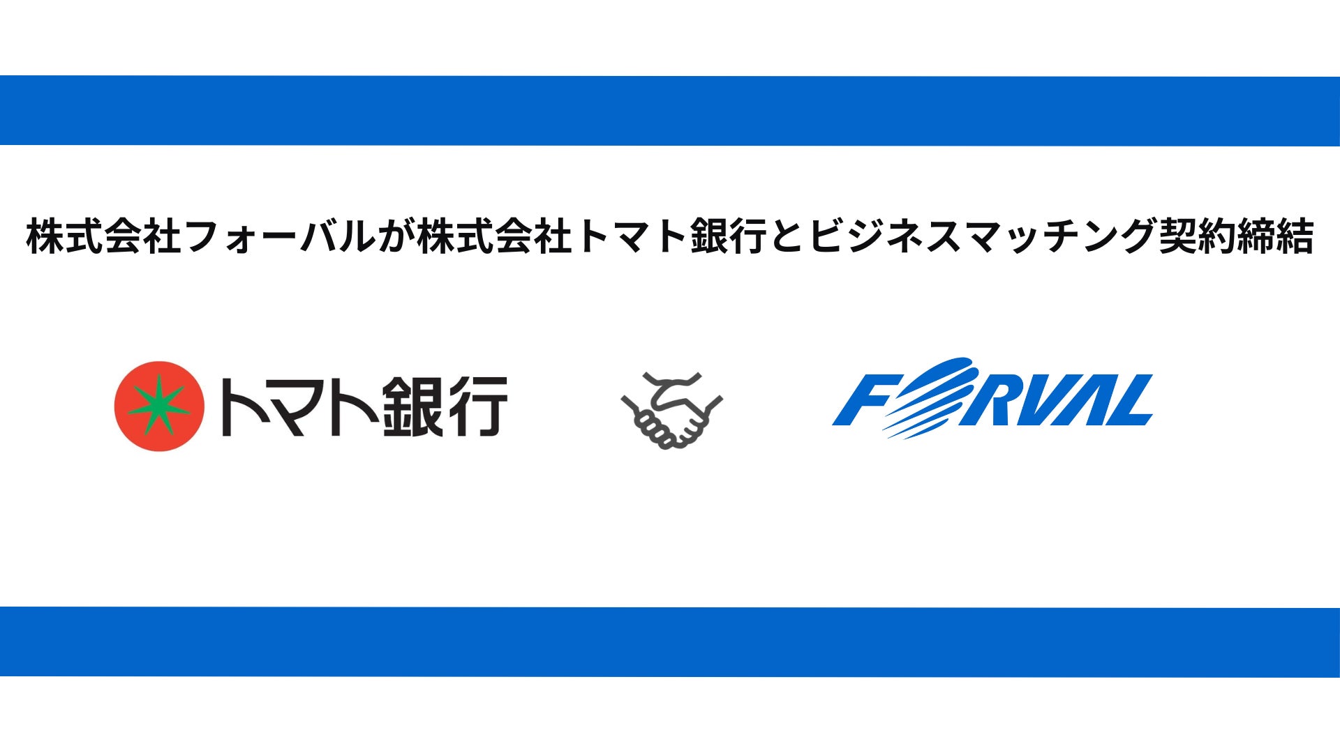 『「新しいあたりまえ」で、新しい世界を創るFORVAL』を理念に掲げ、ESG経営を可視化伴走型で支援する「企業ドクター(次世代経営コンサルタント)集団」の株式会社フォーバル(本社:東京都渋谷区、代表取締役社長:中島 將典、以下「フォーバル」)は、株式会社トマト銀行(本店:岡山県岡山市、取締役社長:髙木 晶悟)とビジネスマッチング契約を締結いたしました。