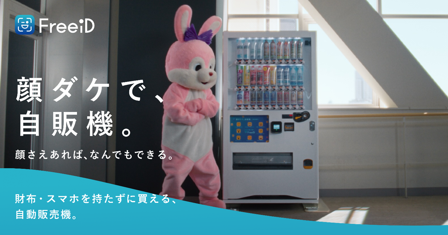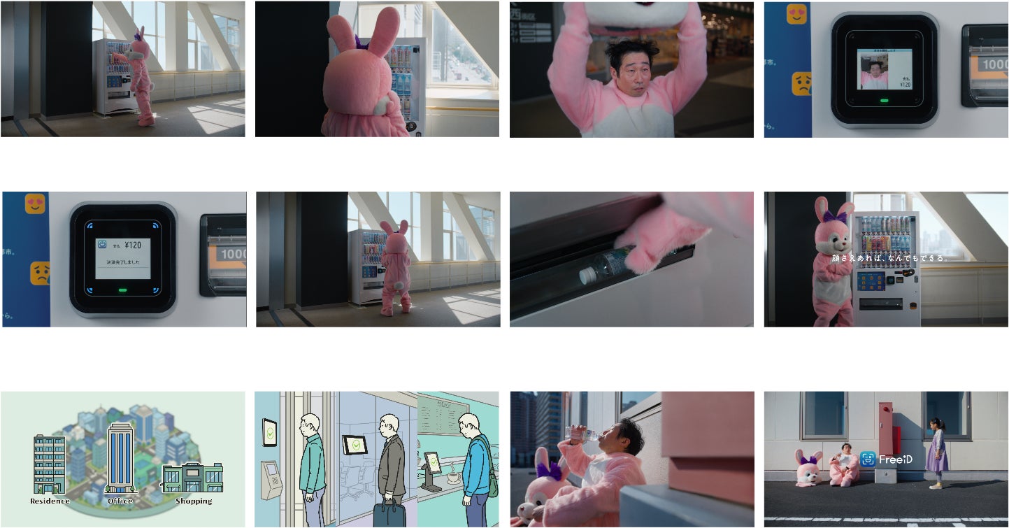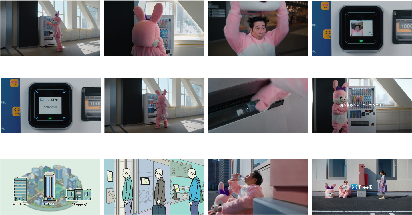 2つ目は、俳優 前野朋哉さんが出演するブランドムービー「顔さえあれば、なんでもできる。」篇です。ショッピングモールで子どもたちに囲まれながら奮闘するうさぎの着ぐるみが、ふと自販機の前で頭部を外し、顔認証で飲み物を購入するというユーモラスなストーリーを通じて、FreeiDの世界観をチャーミングに表現しています。