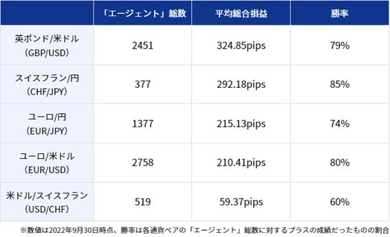 英ポンド/米ドルは9月中旬から大幅下落を見せ、「エージェント」の取引も活発に。勝率は先月の43%から79%にまで上昇しました。