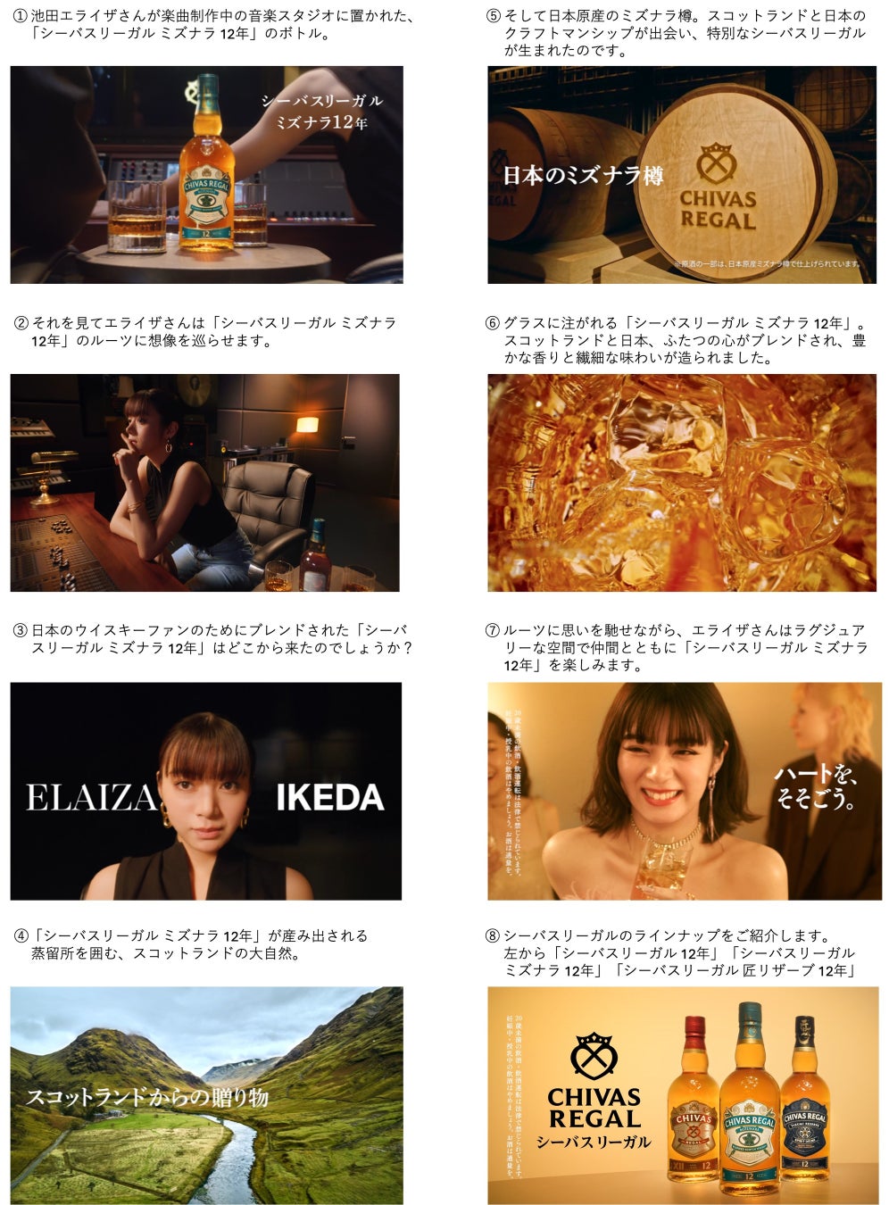 新TVCM「ふたつの心がブレンド」篇は、日本原産のミズナラ樽を使用し日本のウイスキーファンのために特別にブレンドされたスコッチウイスキー「シーバスリーガル ミズナラ 12年」にフォーカスし、池田エライザさんがそのルーツを探る旅をイメージしたストーリーです。映像はスコットランドの美しい自然の風景から始まり、ウイスキーが造られる伝統的な蒸留所を訪れ、日本のミズナラ樽で熟成された「シーバスリーガル ミズナラ 12年」が完成。その豊かな香りと味わいを、池田エライザさんがラグジュアリーな空間で仲間とともに楽しむシーンで締めくくられます。スコットランドと日本のウイスキー造りのクラフトマンシップが出会い、特別なブレンドが生まれた「シーバスリーガル ミズナラ 12年」のストーリーと魅力をエレガントに伝えるTVCMです。