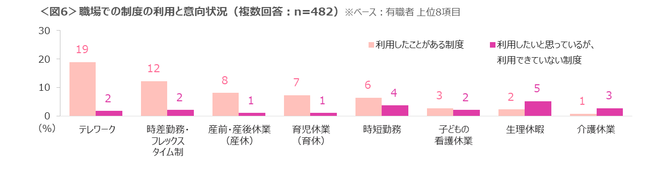 有職者に職場の制度の利用状況や意識を確認した。利用経験が高いのは「テレワーク」「時差勤務・フレックスタイム制」など。”利用経験”より”利用したいが利用できていない”方が高いのは「生理休暇」と「介護休業」である。<図6>