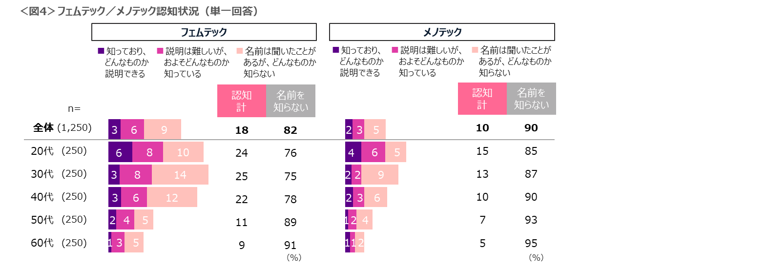 フェムテックの認知率は18%、メノテックは10%と全体の認知率は低い。どちらも若い世代ほど認知率は高いものの、フェムテックで20%台、メノテックは10%台程度である。<図4>