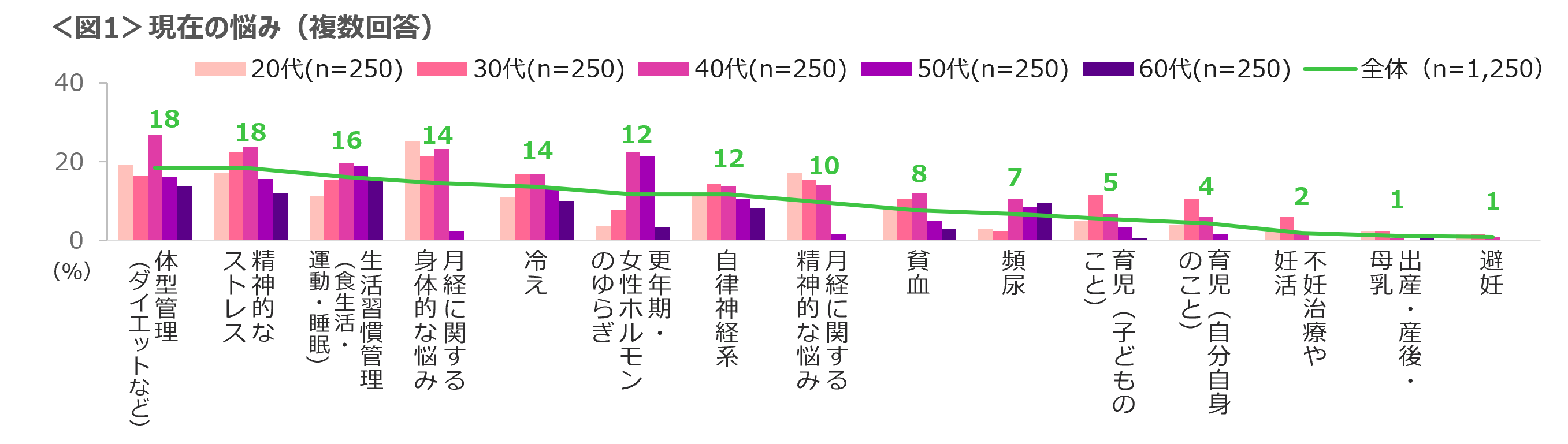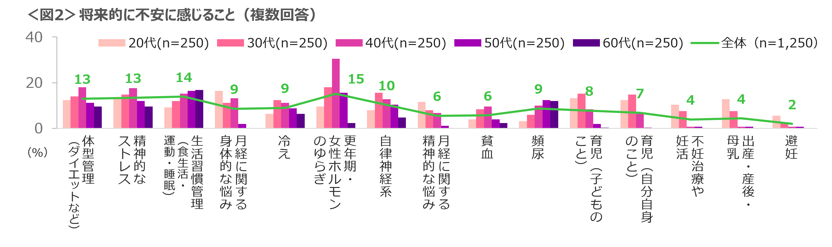 女性の現在の悩みは、「体型管理」「精神的なストレス」「生活習慣(食生活・運動・睡眠)管理」「月経に関する身体的悩み」「冷え」などが多くあがった。年代別には、20~40代の月経に関する「身体的悩み」と「精神的悩み」、40代の「体重管理」、40~50代の「更年期・女性ホルモンのゆらぎ」が目立つ。<図1>