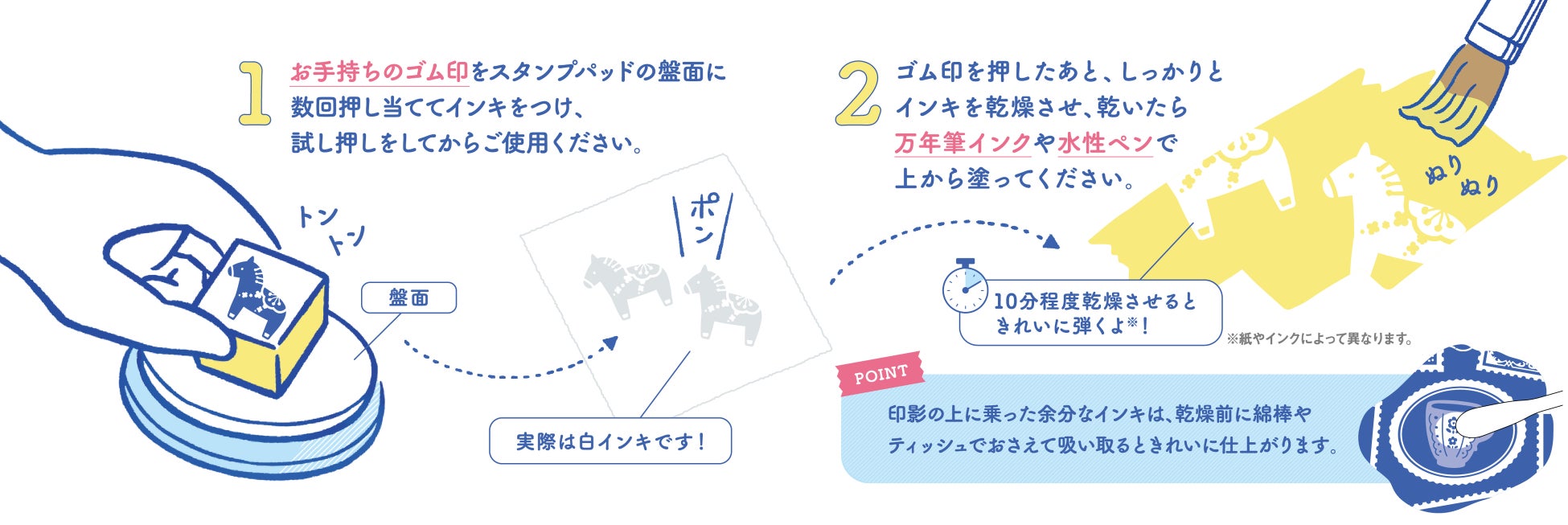 水性染料インキを弾く特殊インキの採用により、押した印影の上から万年筆インクや水性ペンで塗ると、色を弾いて下からイラストが浮き出たように見えます。