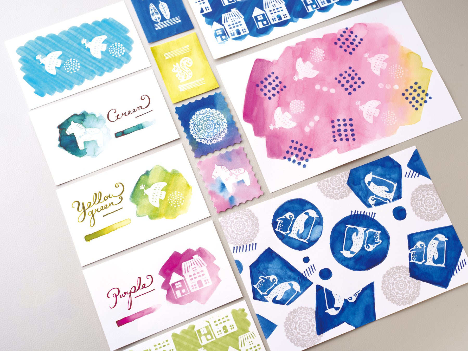 「ウキデル」は、水性染料インキを弾く特殊インキを採用した白色のスタンプパッドです。ウキデルを使用してお手持ちのゴム印を押した印影の上から万年筆インクや水性ペンで塗ると、色を弾いてイラストが浮き出たように見えます。さまざまな色の万年筆インクを持っていても使い切れないという方におすすめのアイテムです。万年筆インクの色見本やポストカードデコなどアイデア次第でいろいろな使い方ができます。