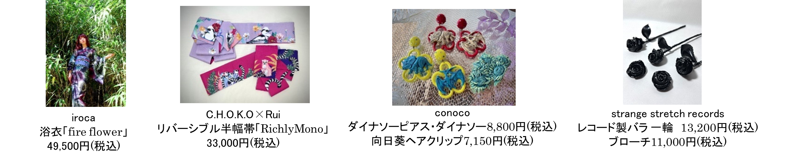 さらに、ゲストとしてキモノディレクター・カリスマキモノブロガーであるCHOKOのブランド「C.H.O.K.O」、フツウの可愛いじゃ物足りないオトナのためのアクセサリー「conoco」、キズ盤レコードのリサイクル、通称レコード曲げ屋「strange stretch records」が顔を揃え、現代にリアルな色を添えます。