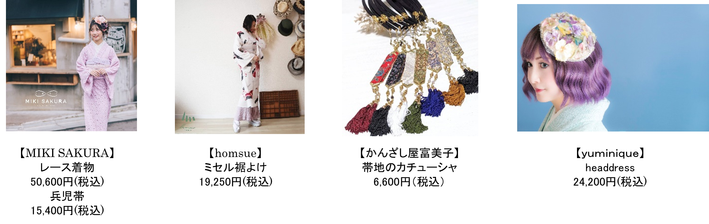 「MIKI SAKURA」は、美しいkaoriに包まれた凛とした女性をコンセプトにレース着物・帯など、女性なら心ときめくアイテムで溢れるブランドです。POP UP SHOPでは、MIKI SAKURAやhomsueなど店舗を持たないブランドのレース着物やレースをはじめ、ヘッドドレス・かんざし・ミセル裾除け・小物・アクセサリーなど、作家さんによる一点物のアイテムも多数取り揃えます。