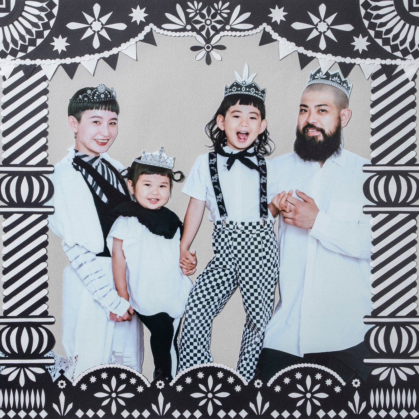 オリジナルの家族写真とお子様のみの写真の2パターンを制作し、お祭り感のある切り絵の世界にコラージュして後日データでお送りします。