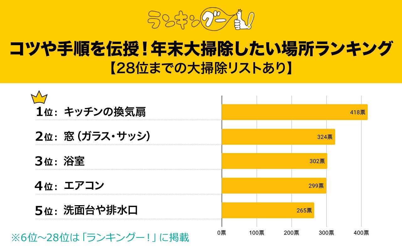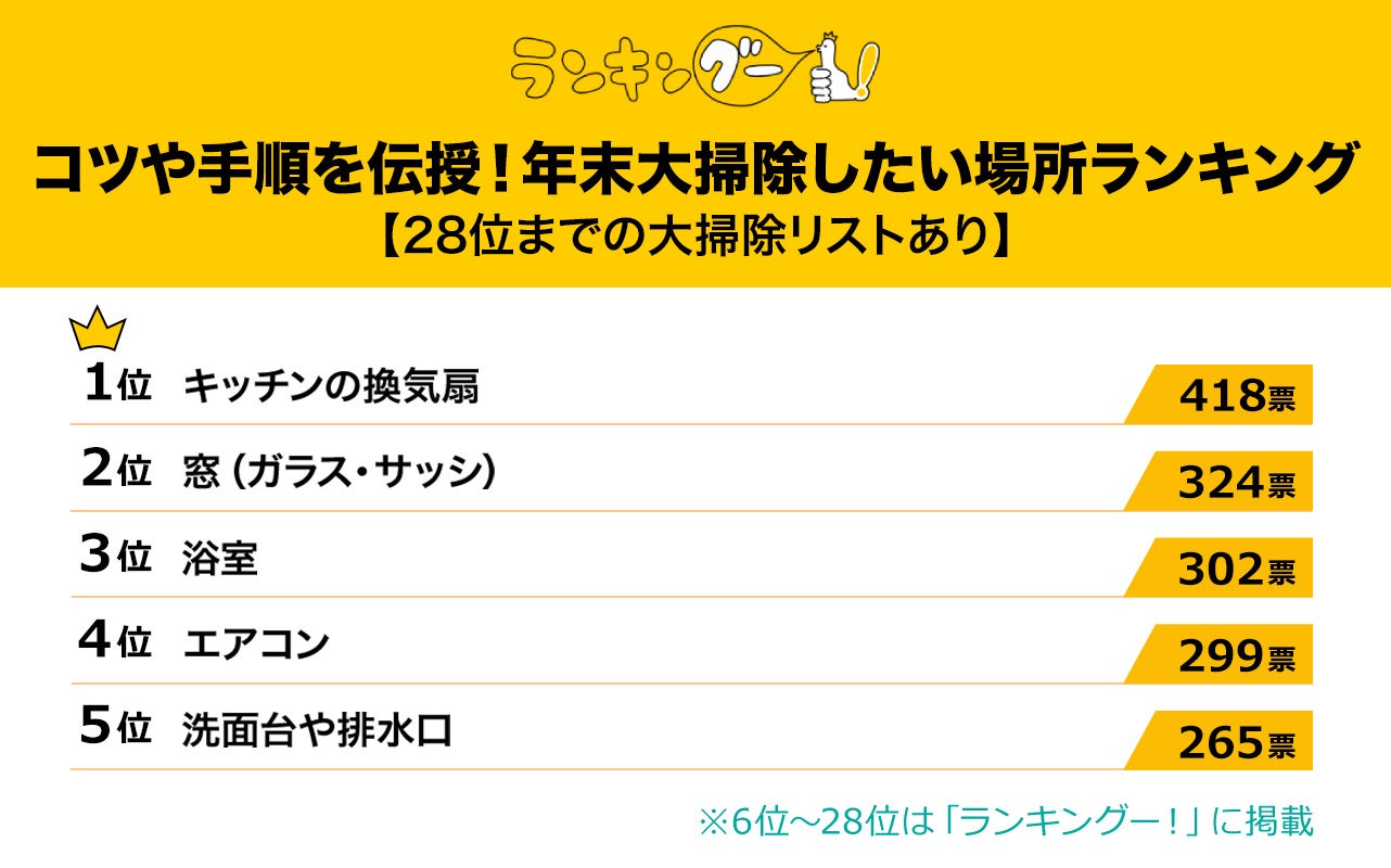 ランキングー!では年末大掃除したい場所をピックアップし、ランキングを調査。10~50代の男女(性別回答しないを含む)5,090名にアンケートを行い、TOP28を決定しました。ここではTOP5をご紹介します。