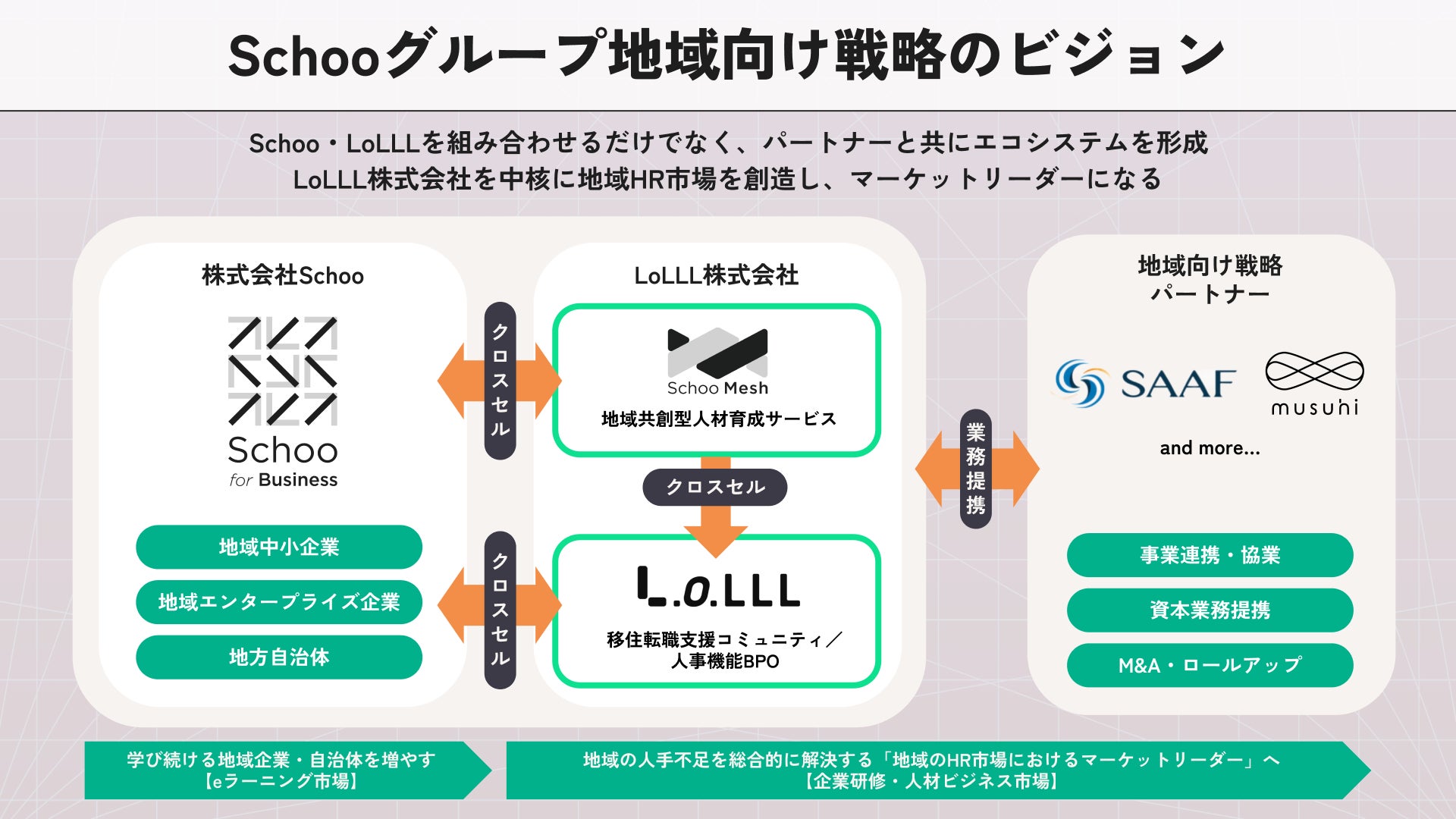 スクーグループは、ロールによる地域での組織基盤の構築と、スクーが提供する学びのサービスを掛け合わせることで、個人と組織の成長を一体で支える仕組みを強化していきます。