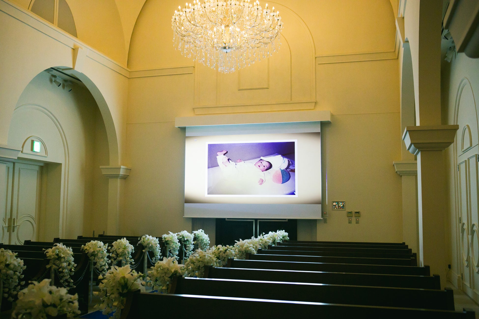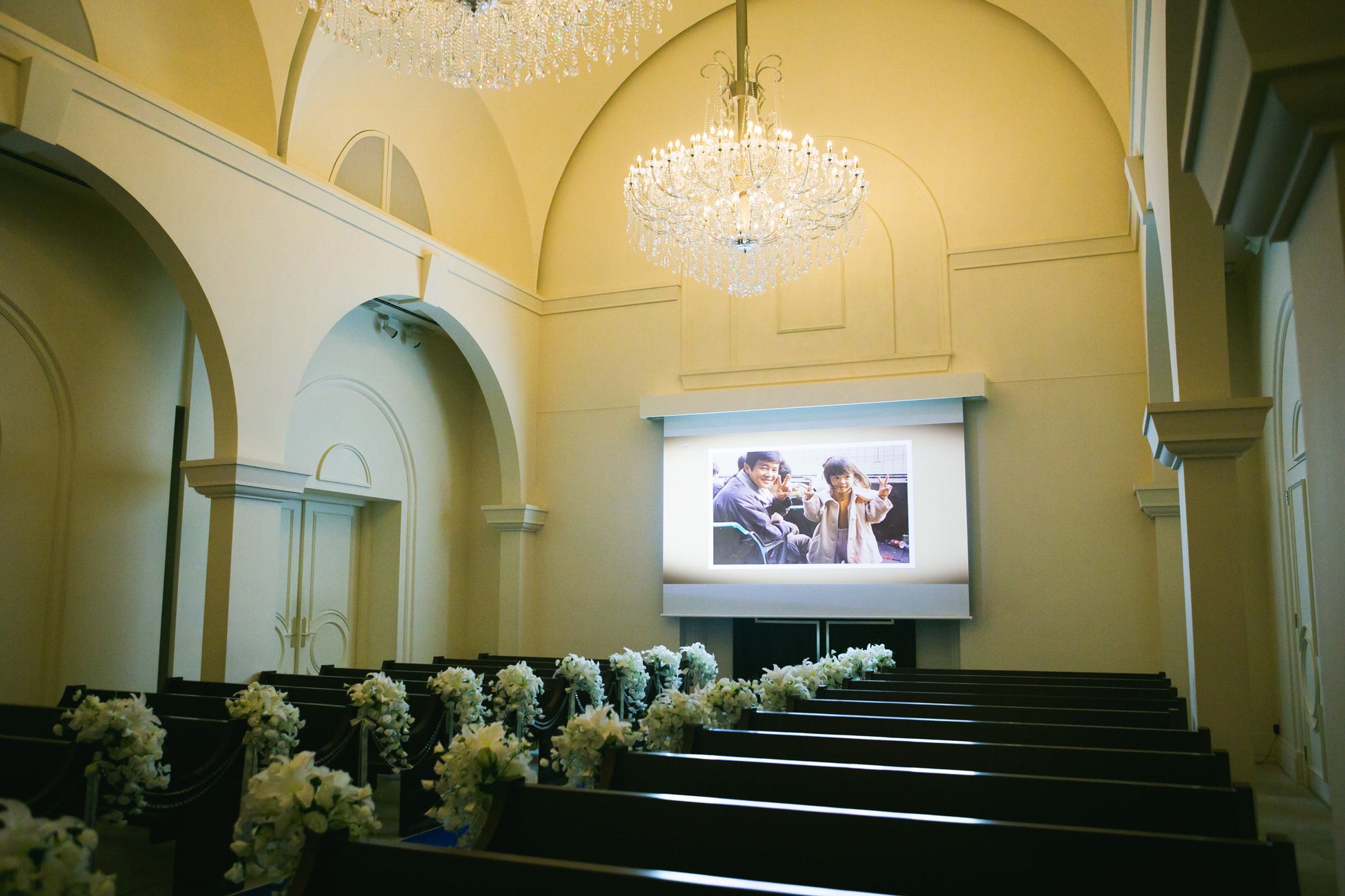 チャペルでの挙式入場直前に上映することで、ご新郎ご新婦の人柄や家族との関係性が事前にお披露目され、その場にいる全員が感動的な雰囲気に包まれての入場シーンが叶います。事前にご新郎ご新婦からメッセージや写真をお預かりして投影するため、おふたりらしさが伝わるムービーが上映できます。