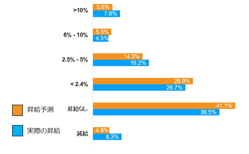 ・日本の従業員の41%が昇給に期待していない一方で、1割以上の昇給があった人は7.8%。(図4)
