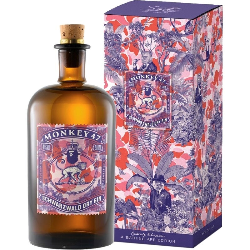 また、今回のコラボレーションではプレミアムパッケージのクラフトジンも登場!!ボトルのラベルやボックスには、ピンクとパープルを基調にした「BAPE®」のアイコンとも言えるABC CAMOに、「MONKEY 47」オリジナルのジャングルプリントを重ねた印象的なデザインを採用。両ブランドのロゴを並べて配置した、限定パッケージです。