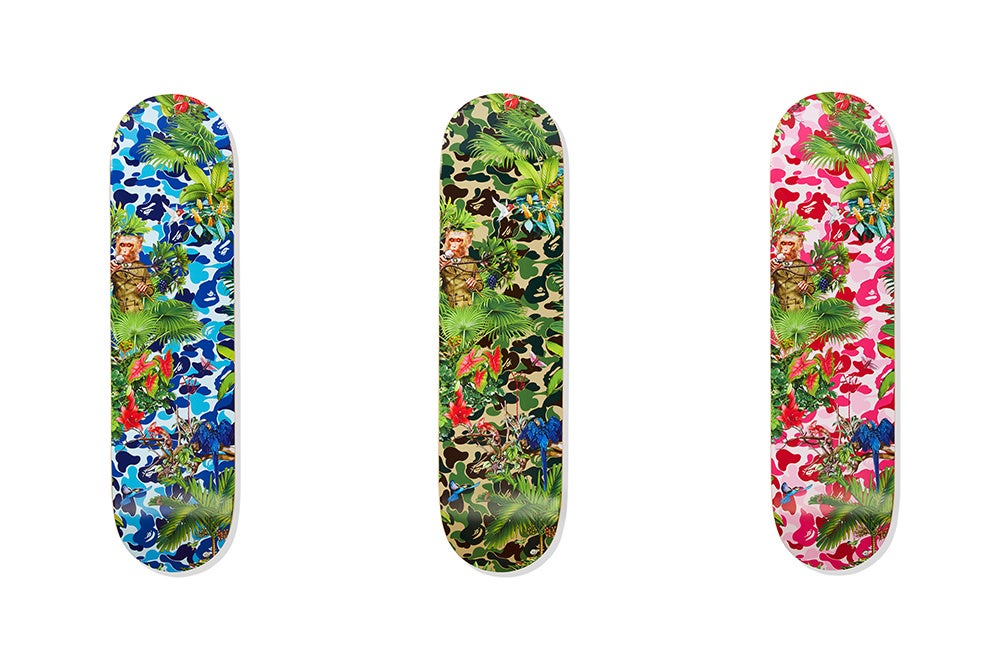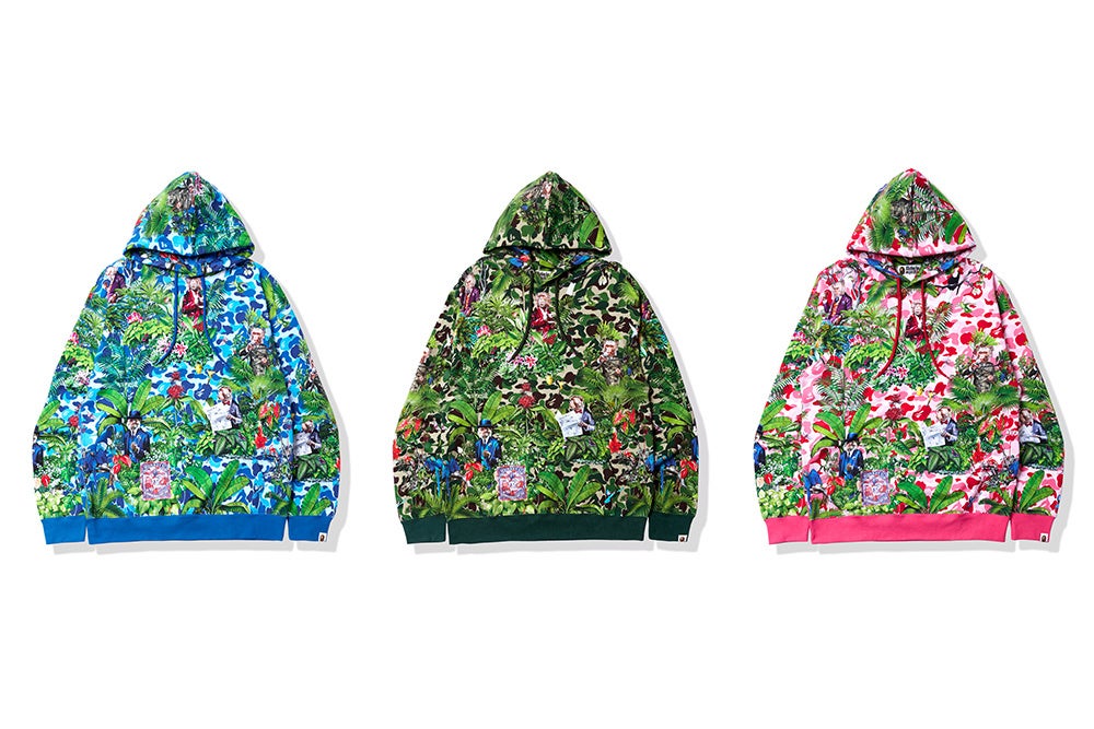 このコラボレーションの5つのシグネチャーアイテムは、いずれもBAPE®のアイコニックなABC CAMOのデザインで、グリーン、ピンク、ブルーの3色展開でのリリース。