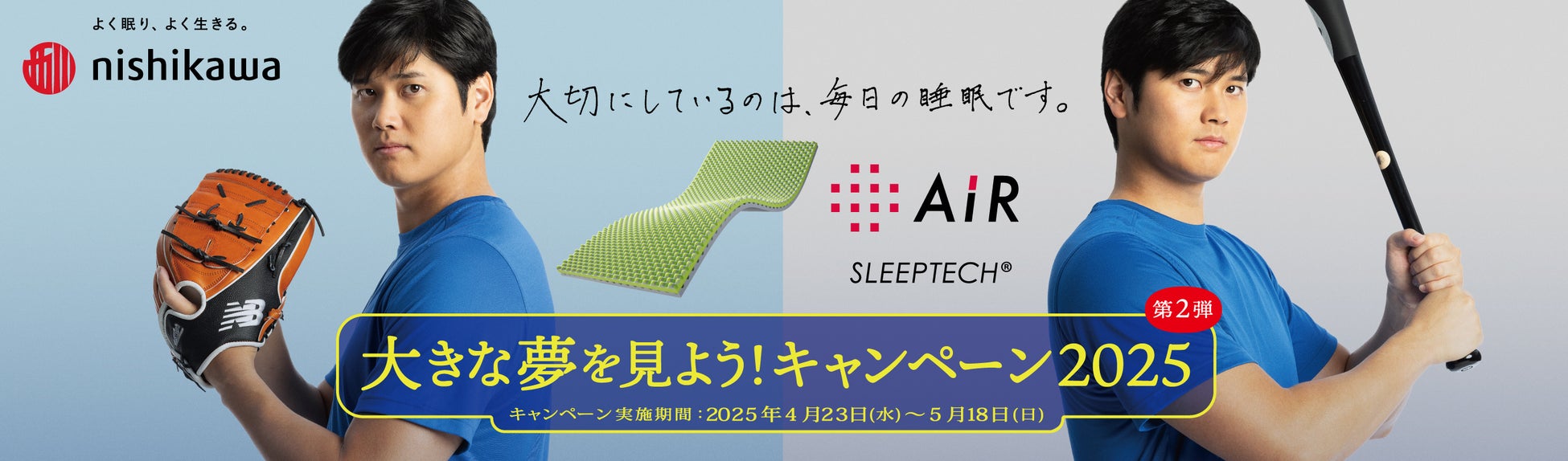 西川株式会社(東京都中央区日本橋富沢町、社長:菅野達志、以下、nishikawa)は、大谷翔平選手を起用した「大きな夢を見よう!キャンペーン2025」第2弾を、4月23日(水)~5月18日(日)の期間中に実施いたします。