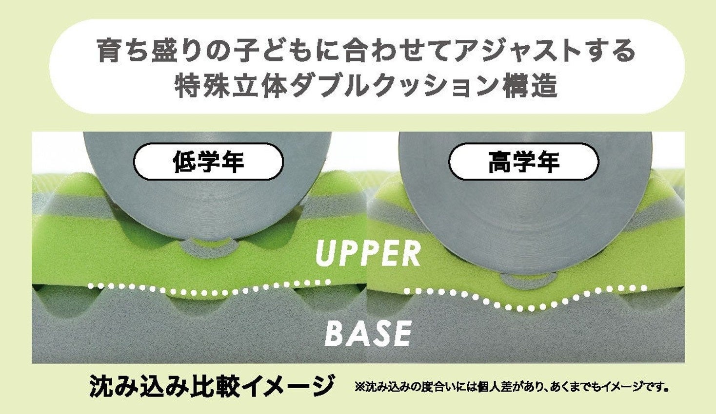 小学校に入学する前から卒業までの時期、子どもの体格は大きく変化します。[エアーG1]マットレスは、成長によって体重が大きく 変わっても、特殊立体ダブルクッション構造によって体の沈み込みを調整します。体重が軽い成長期前は上層部のやわらかく細かい凹凸でやさしく支え、成長するにつれて増える体重や体格を下層部がしっかりと受け止め、体にフィットします。