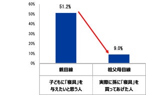しかし、実際に祖父母が孫に寝具をプレゼントした割合はわずか9%と低く、他のプレゼント候補と比べても最下位という結果になりました。