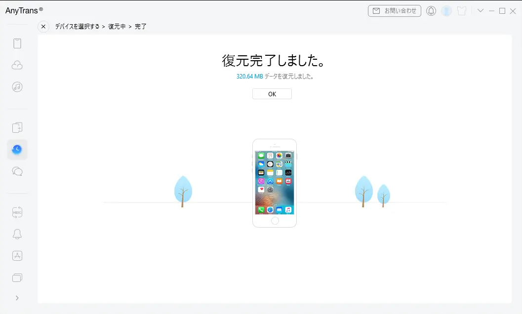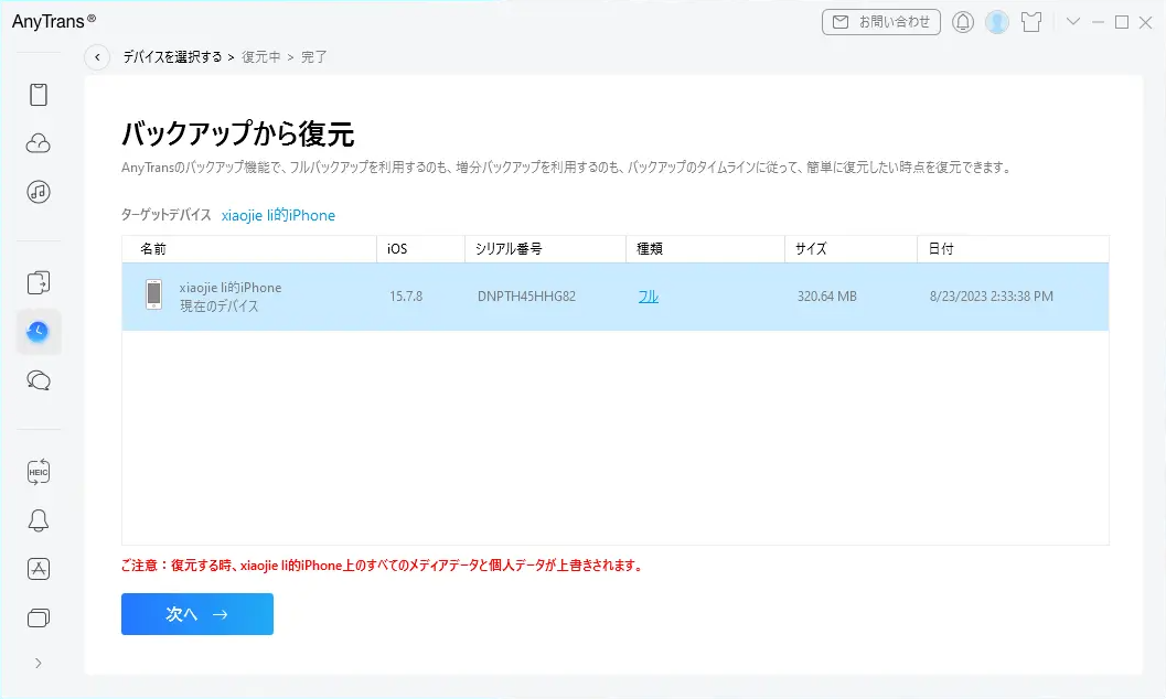 バックアップを復元したいなら、AnyTransの「バックアップから復元」機能で対象デバイスに簡単に復元できます。