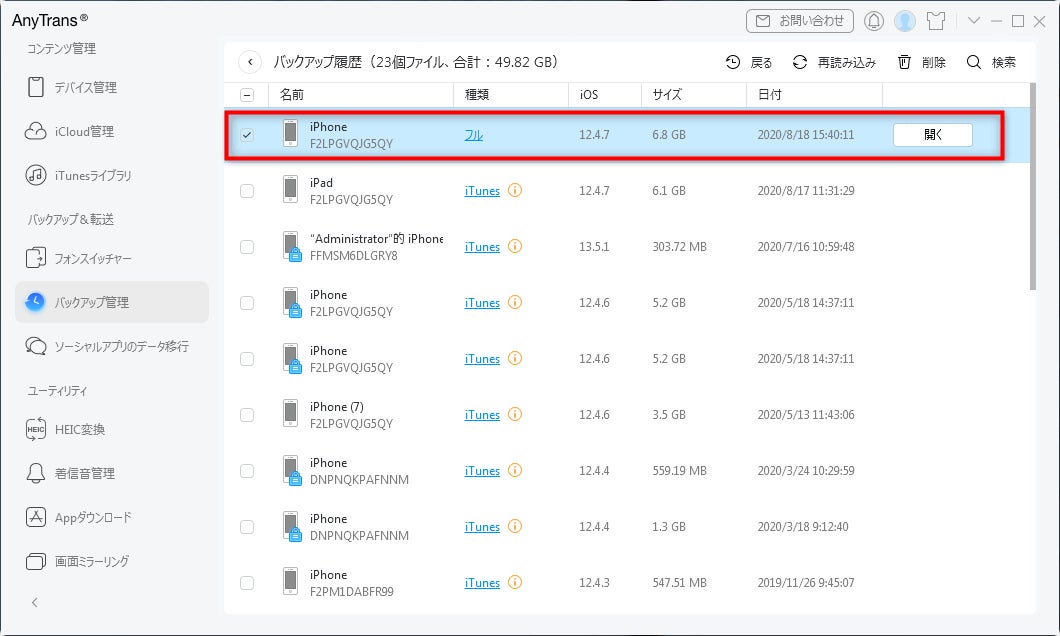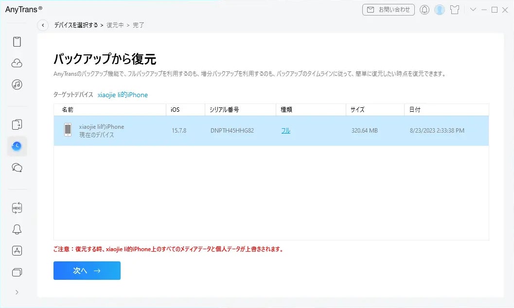 Step2.AnyTrans・iTunesに作成したバックアップを検出します。復元したいバックアップを選択します。