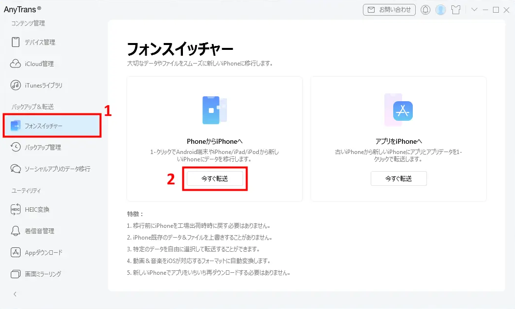 Step2.AnyTransを起動して、ホーム画面で「フォンスイッチャー」を選んで、「PhoneからPhoneへ」の「今すぐ転送」をクリックします。