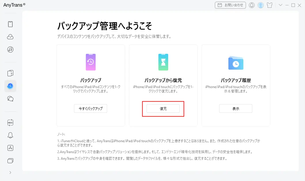 Step1.AnyTransで「バックアップ管理」から「復元」ボタンをクリックします。
